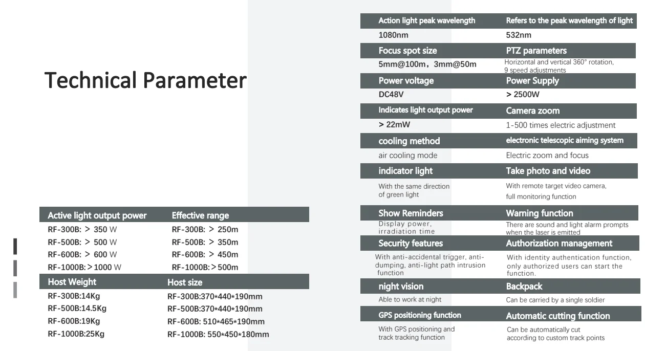 The six generation RF Series portable laser obstacle remover is newest laser system ,the system can realize long-distance(large than 500meters), high-power (350w -1000W) operation. The integrated design is easy to carry outdoors,and the operation is simple and convenient.